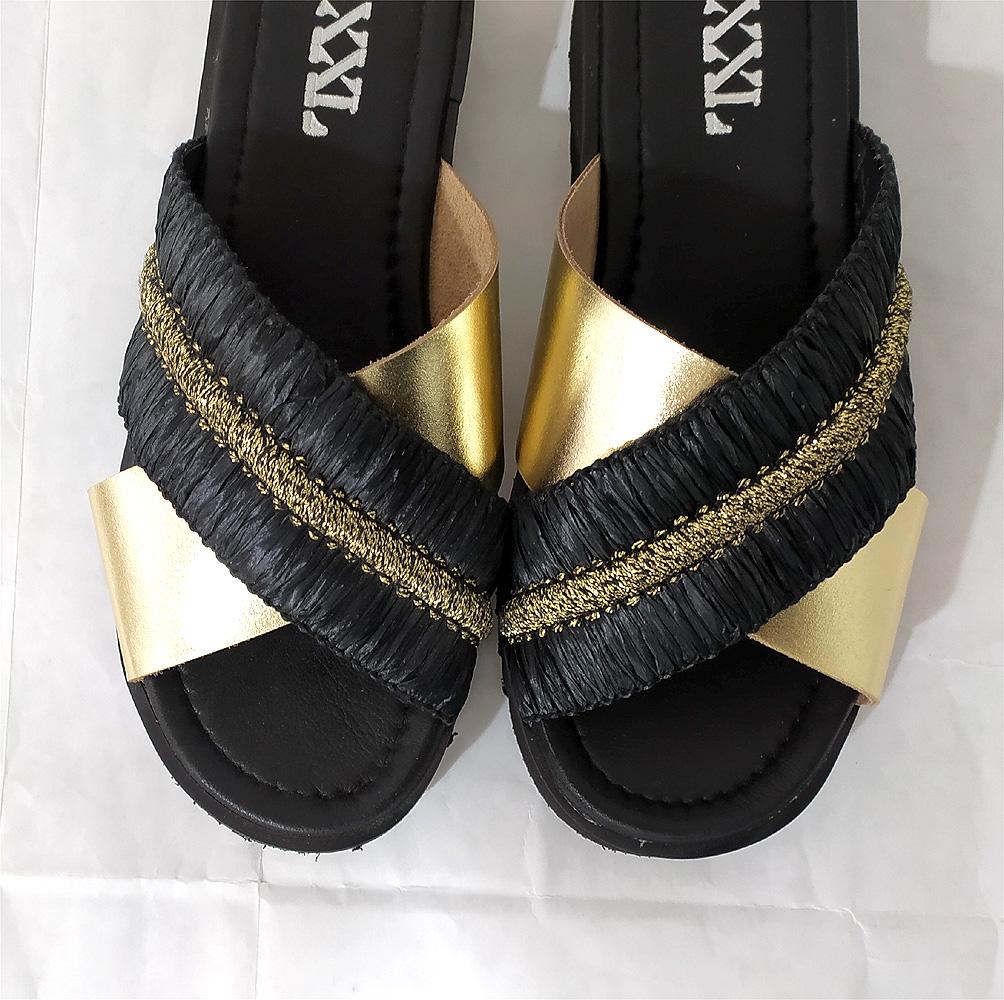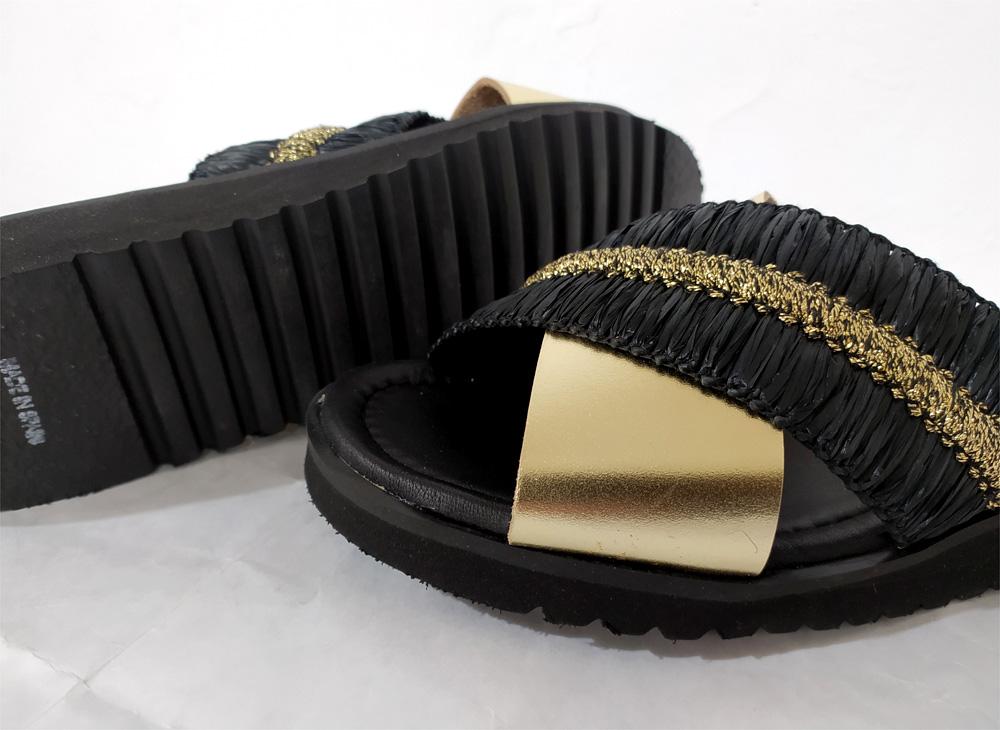 Zueco en ancho especial en piel dorada y rafia negra con un detalle en dorado. Para pies anchos en tallas del 40 al 45. Más colores disponibles en la web. Atentas a las medidas: