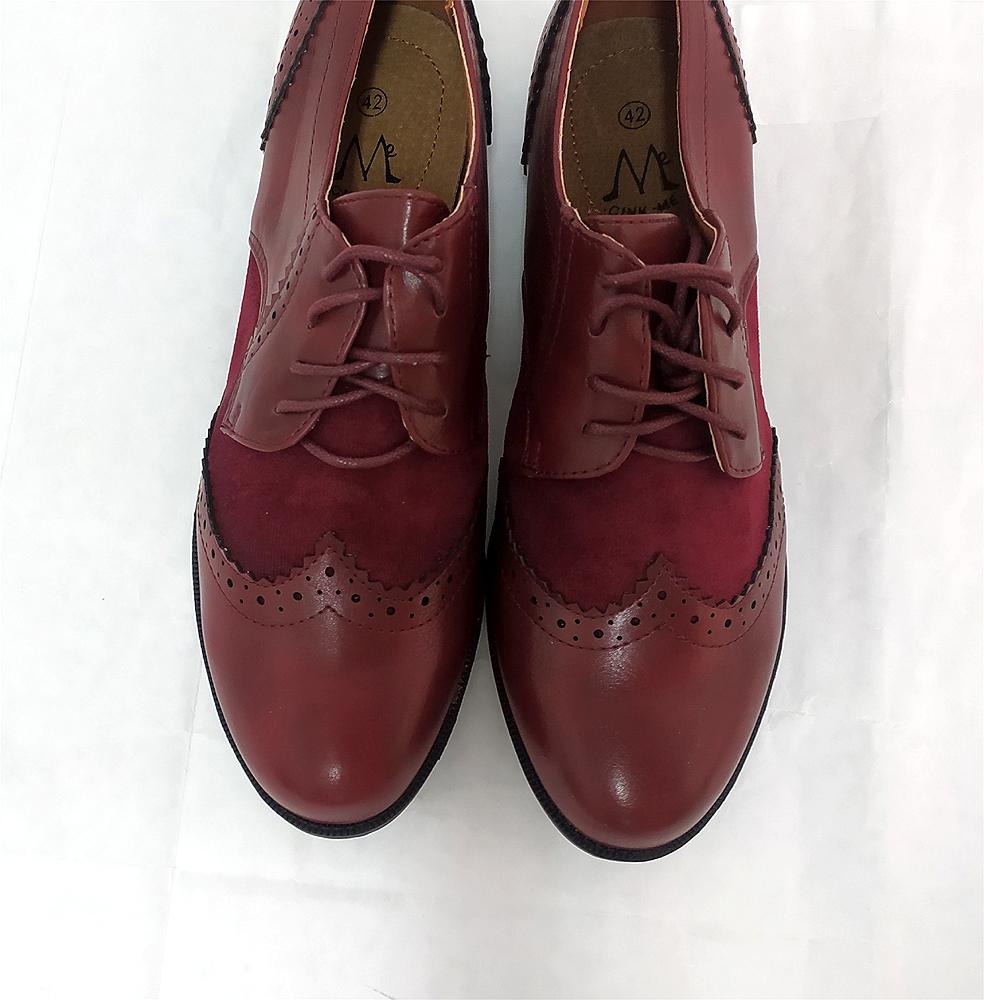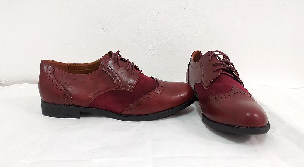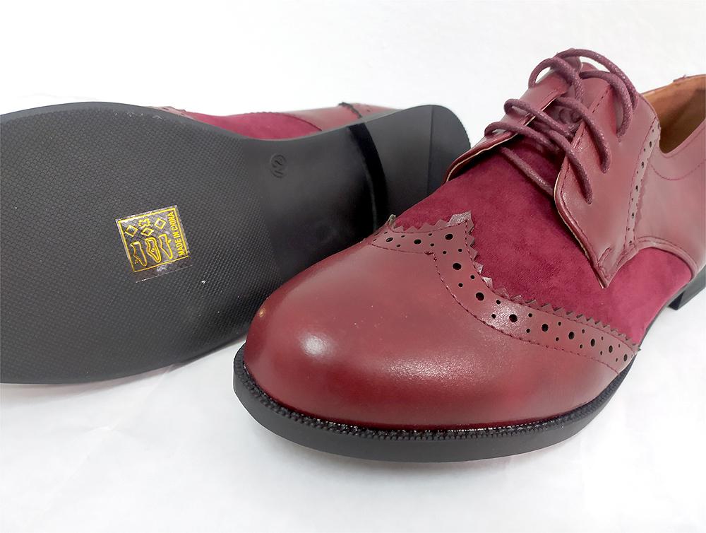 Un zapato para el día a día que podría ser unisex pero que por su terminación es más femenino. Zapato de cordones de tallas 41 a 44 en imitación ante y piel color burdeos con detalles picados. Forro interior y plantilla acolchada en piel natural. Ancho en la zona de los juanetes pero ideal para pies estrechos que necesitan sujeción. Medidas: