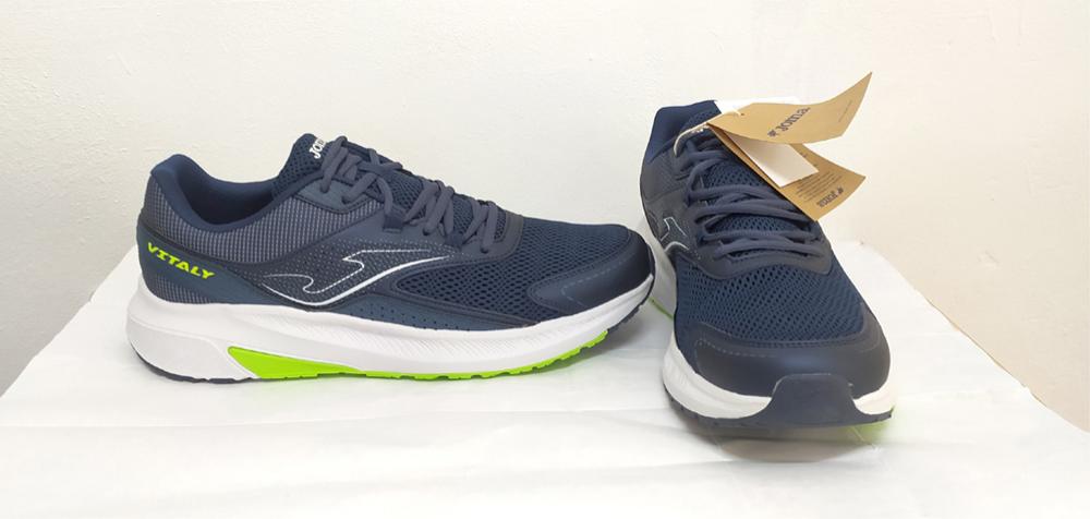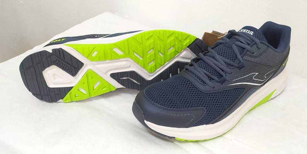 Deportiva de Joma para running. Azul marino con un toque verde en la suela. Uno de los modelos básicos de la marca con suela que amortigua la pisada. Exterior en textil para una mayor transpiración del pie. Solo tallas del 47 al 50. Van bien de talla y además dan ancho en la zona de los dedos: