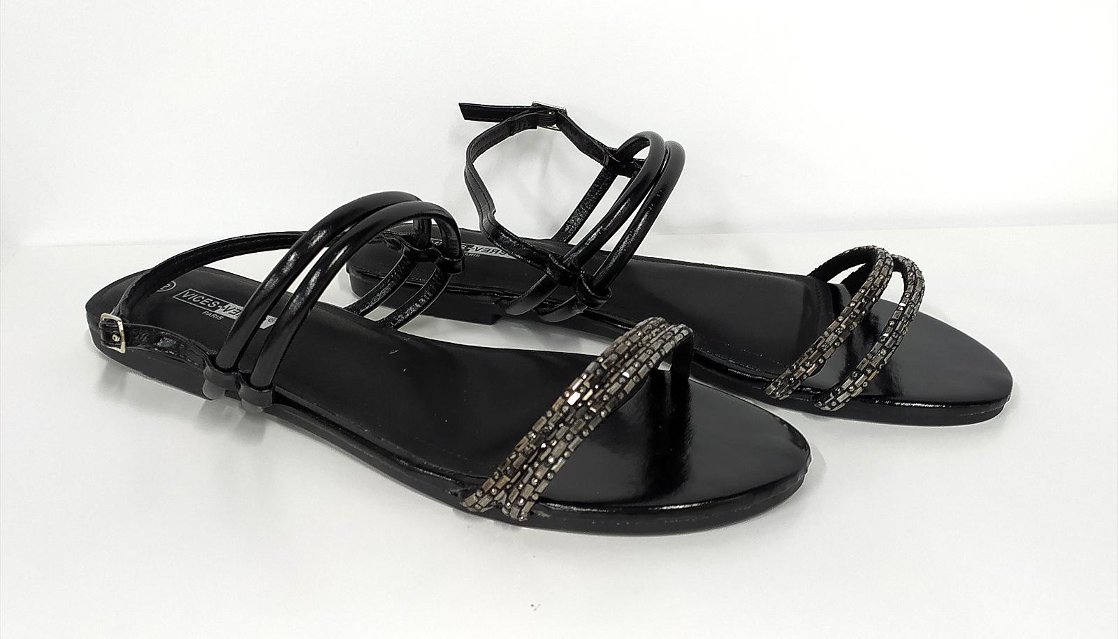 Sandalia plana en negro con adorno en plata vieja en las cintas de la pala. Suela en goma semirrígida y plantilla acolchada. Desnivel planta talón: 0,5 cm. Dan el largo habitual en talla grande. La medidas son de extremo a extremo y los dos anchos de las cintas: