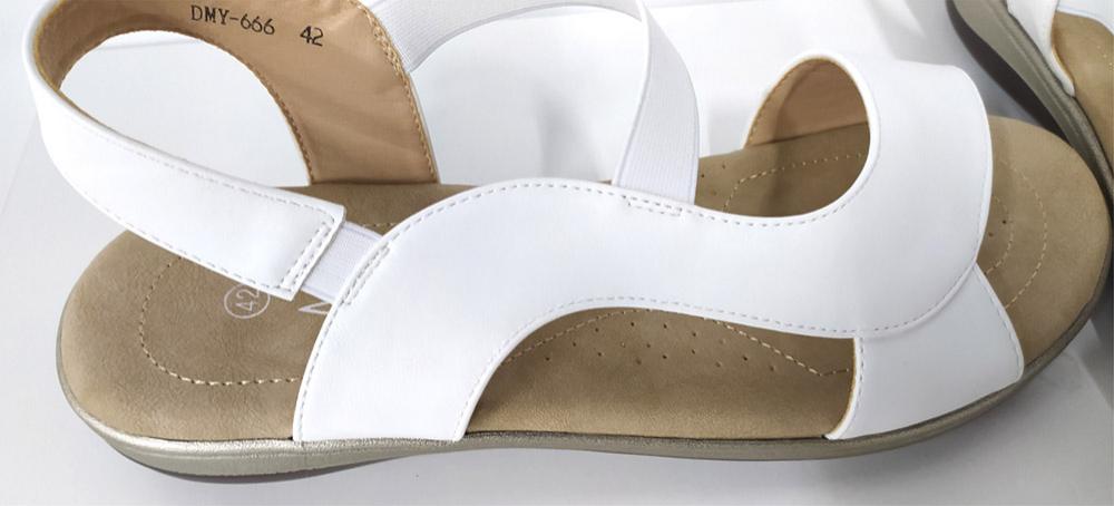 Sandalia de cuña baja, 3 cm en talón y 1 cm en planta, en blanco. Suela ancha con plantilla acolchada y gomas en empeine y parte trasera para una puesta fácil. Más colores disponibles, atentas a las medidas del empeine para que no os queden grandes: