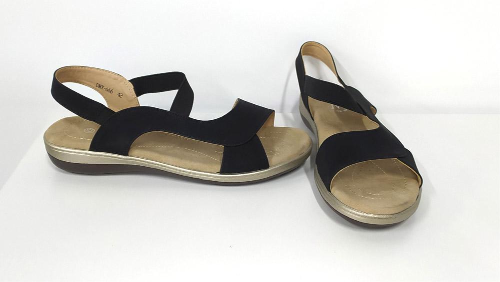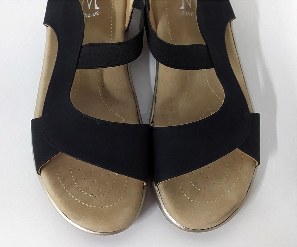 Sandalia de cuña baja en negro, ese color que no puede faltar. Terminación en textil mate. Dan ancho pero si necesitas más, mejor el otro modelo. 3 cm de cuña en el talón y 1 cm en la planta sobre una plantilla acolchada. Como ir en zapatillas de casa. Os dejo las medidas: