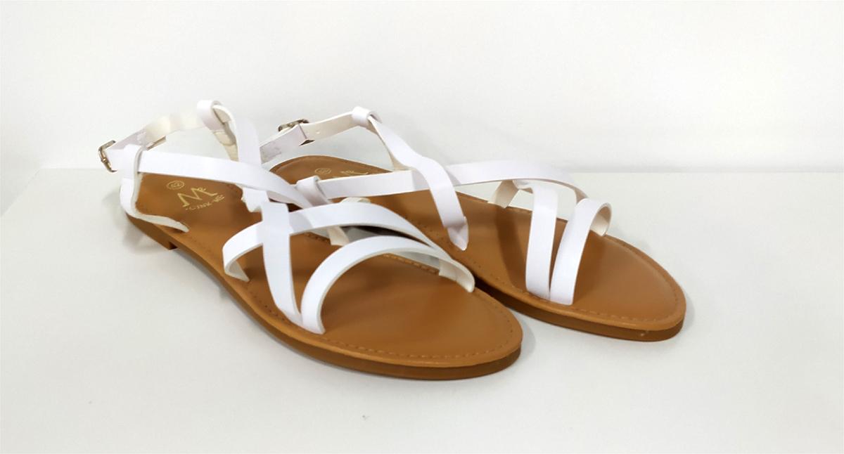 Terminación en blanco para esta sandalia plana de tira cruzada en el empeine. Especial para pies estrechos. Suela plana gruesa y tacón de medio centímetro sobre una plantilla extra gruesa. Atentas a las medidas: