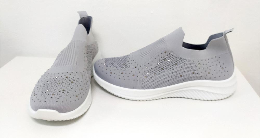 Deportiva en textil grís con pedrería sin cordones tallas 41 a 44. Uno de nuestros éxitos en años anteriores. Dan ancho y largo, se estiran con el uso, coge la talla justa. Plantilas extraibles y suela de goma gruesa. Medidas de la plantilla: