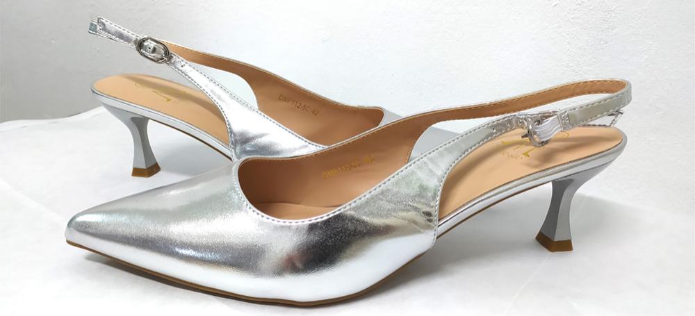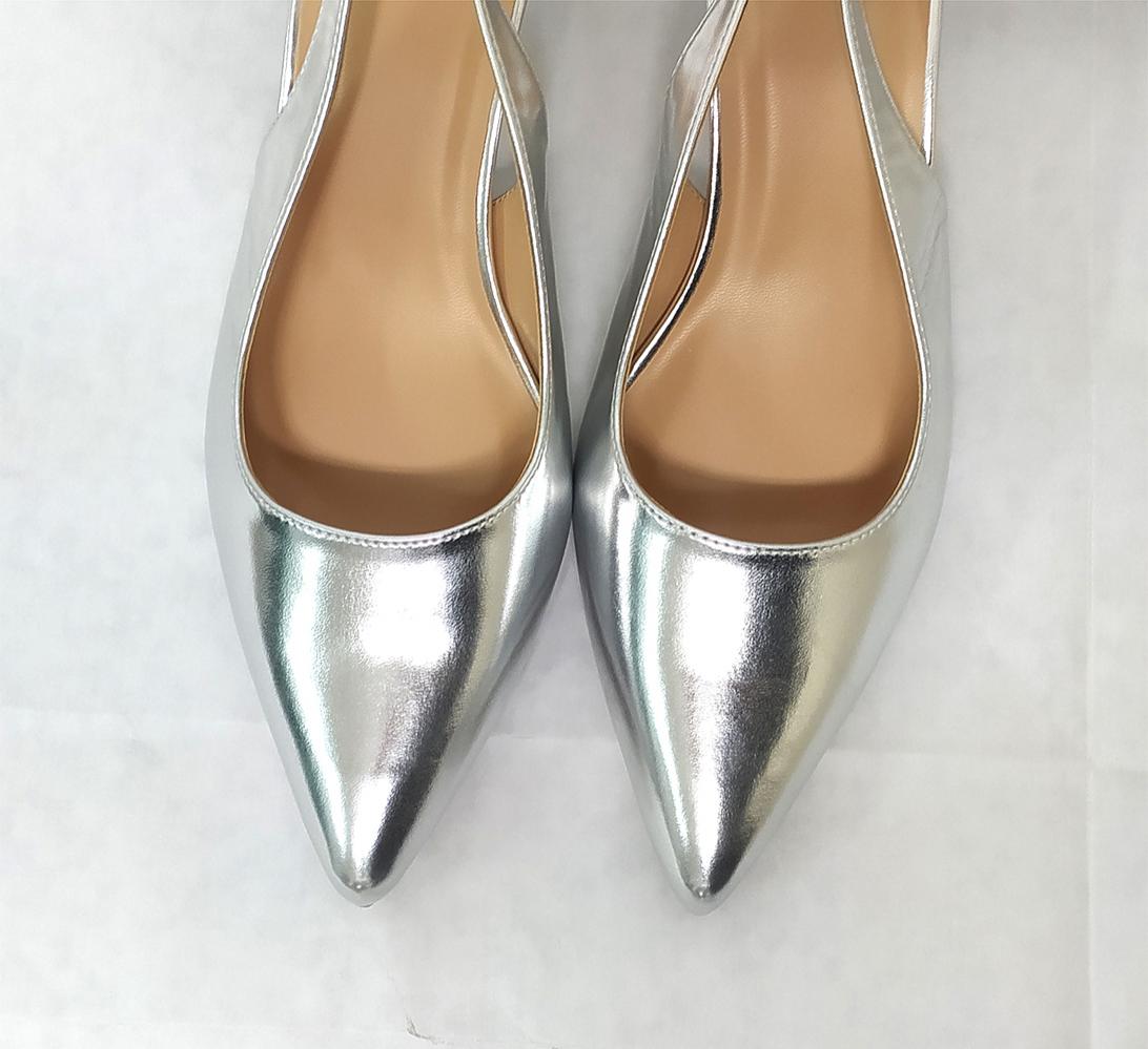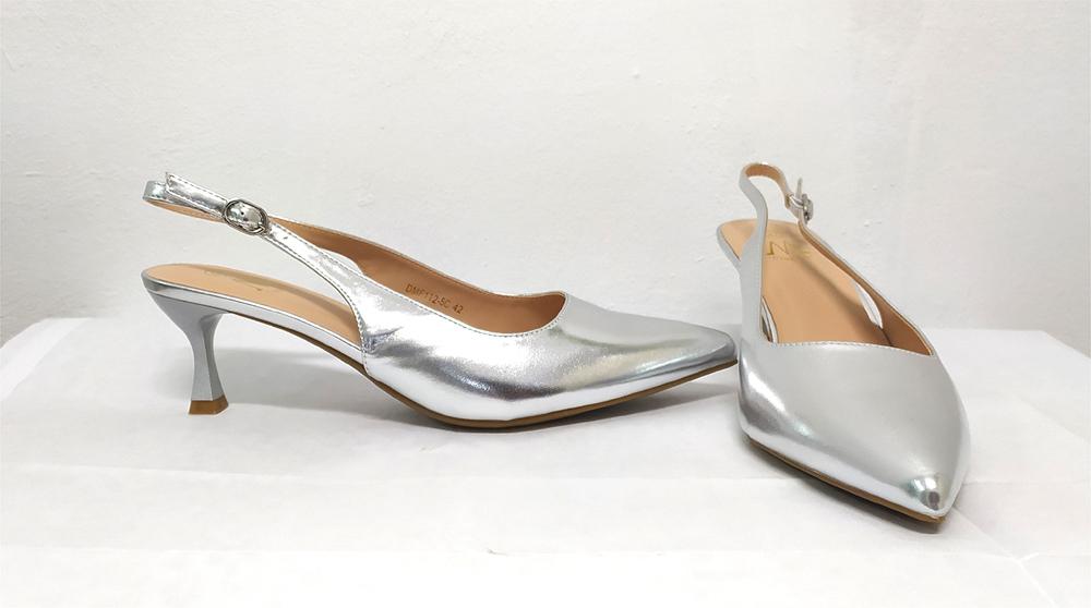 Zapato de tacón en 5 cm de altura destalonado y con terminación en punta. Color plata, ideal eventos para combinar con cualquier vestido. Dan un ancho normal pero si tienes el pie estrecho al ser punta puedes necesitar una talla menos. Os dejamos las medidas dejando la punta libre;