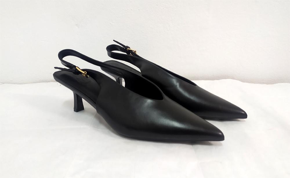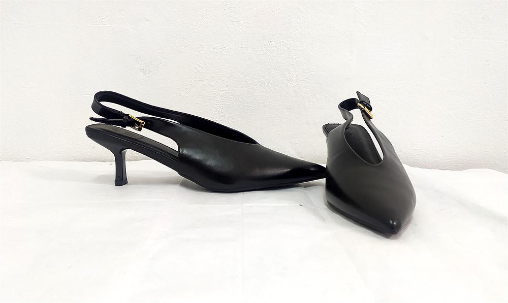 Sigue la tendencia de los destalonados y el color negro no puede faltar. Hemos escogido este modelo con la pala en triángulo para afinar los pies anchos y permitir la entrada del juanete sin rozar en la costura. En pies estrechos dan mucho largo por la punta alargada. Tacón de carrete fino, éste con 5 cm de alto. Goma en la hebilla regulable y plantilla gruesa en metatarso. Terminación en sintético. Medidas sin contar la punta, dan largo: