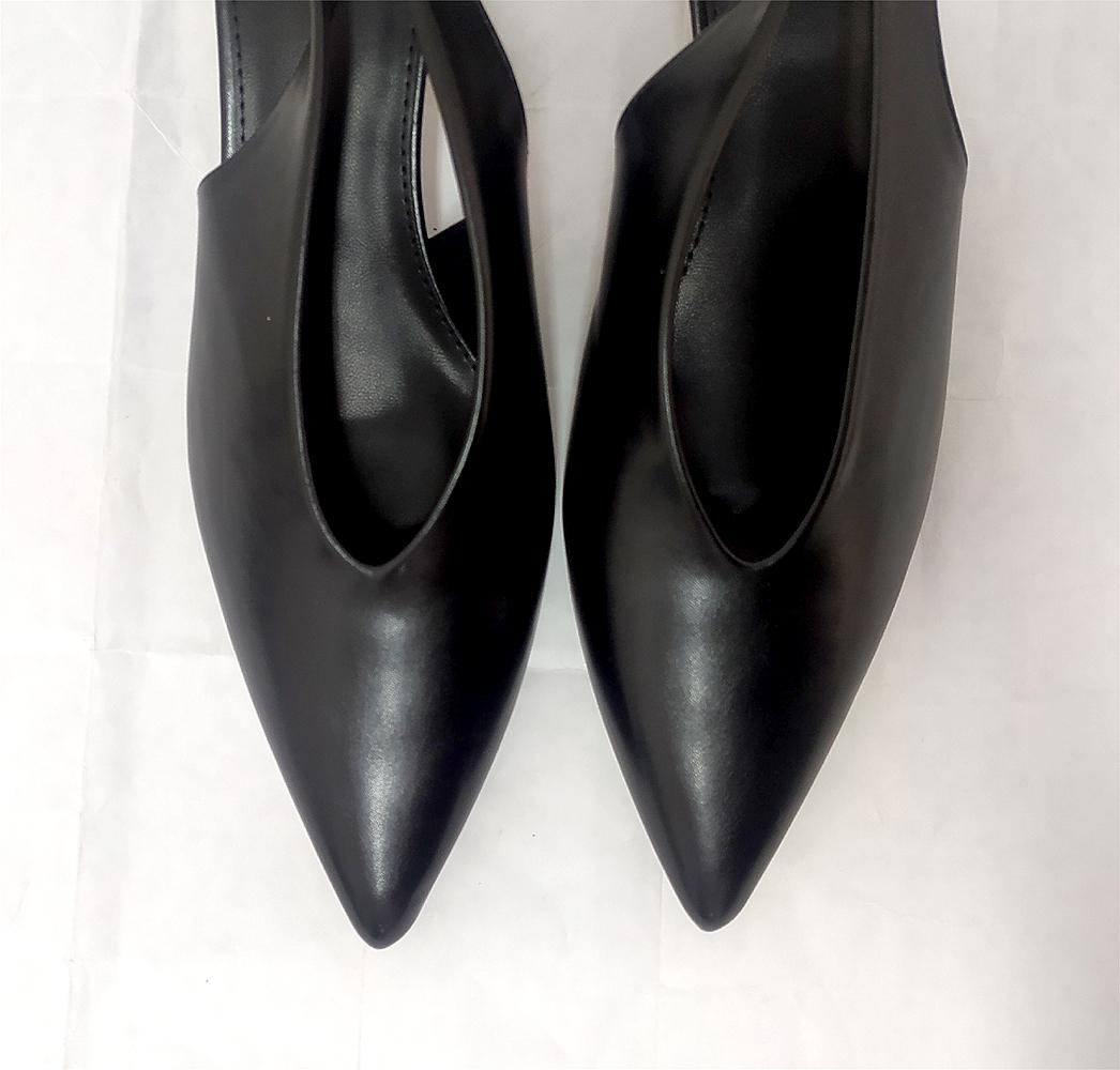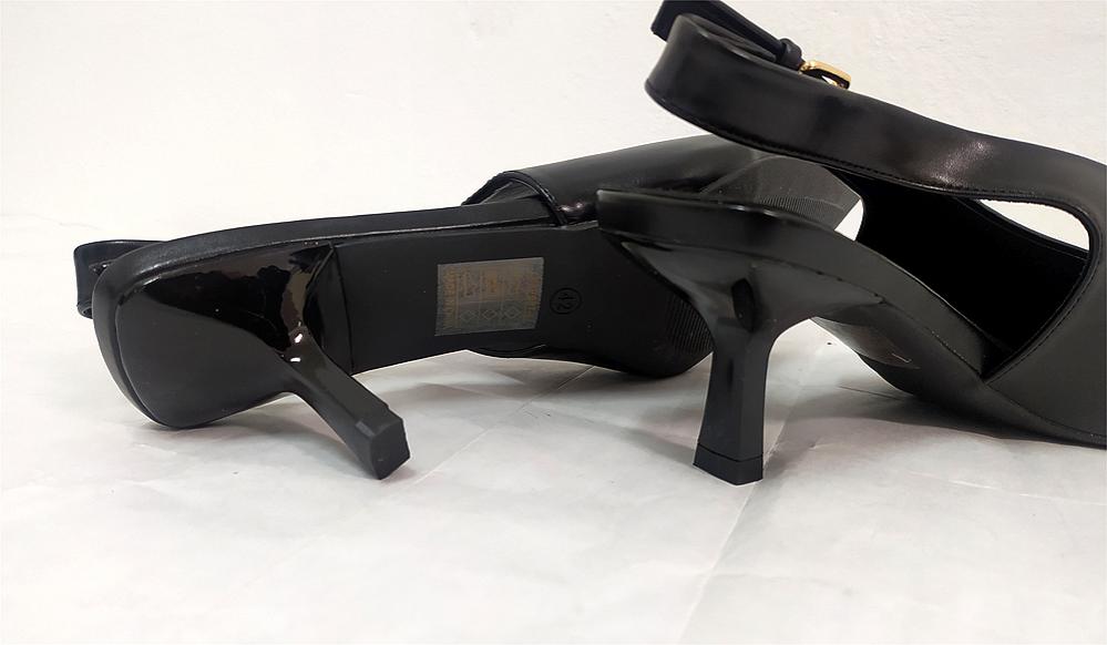 Destalonado negro en tacón fino de 5 cm. Terminación en sintético y punta larga con lo cual dan mucho largo en los pies estrechos. Pala en pico para afinar los pies anchos y admitir juanetes. Plantilla interior acolchada. Goma en la hebilla. Un ancho normal, si tienes el pie fino pide una o dos tallas menos. Las medidas de largo que os indicamos son dejando la punta libre: