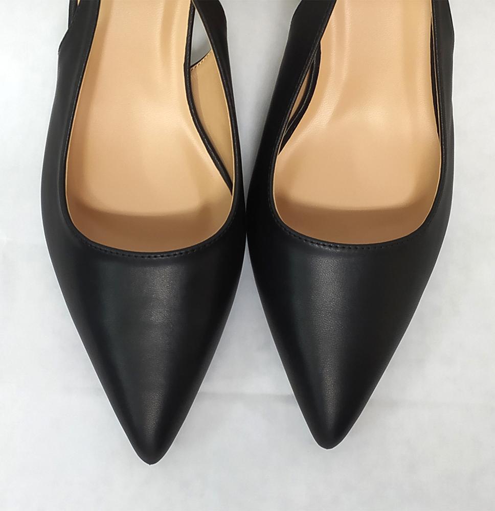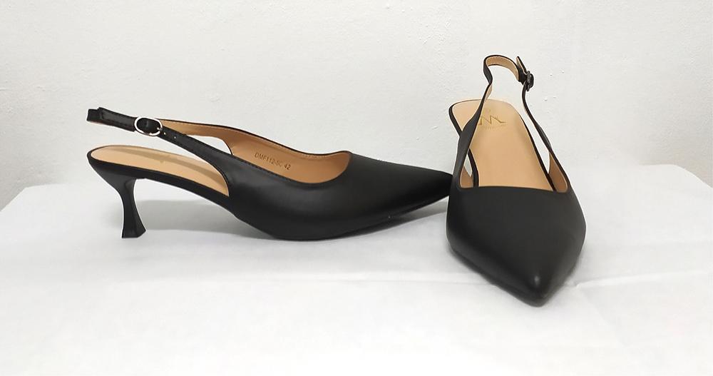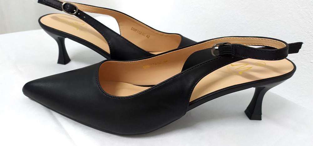 Destalonado negro en tacón fino de 5 cm. Terminación en sintético y punta. Plantilla interior acolchada. Goma en la hebilla. Un ancho normal, si tienes el pie fino pide una talla menos. Las medidas de largo que os indicamos son dejando la punta libre: