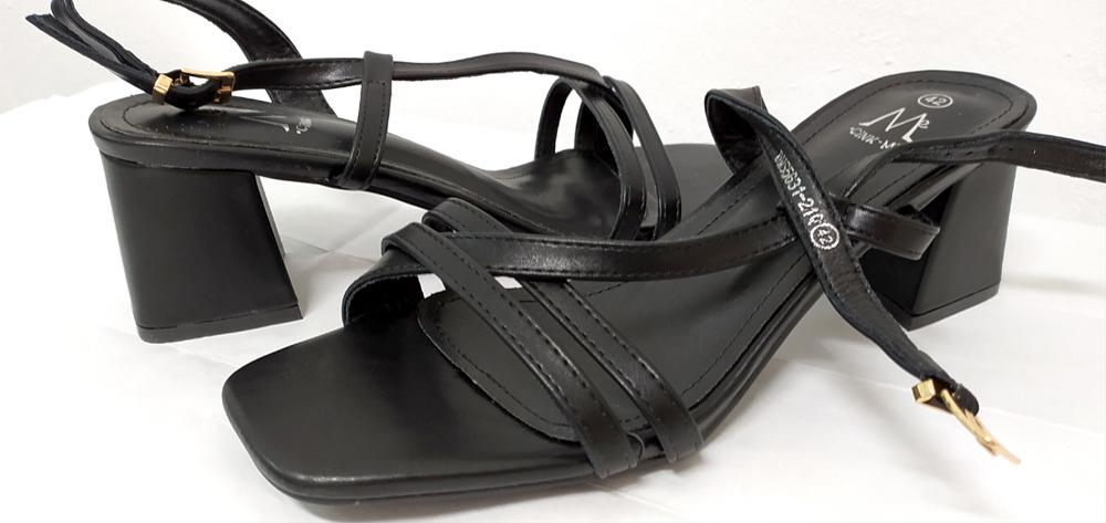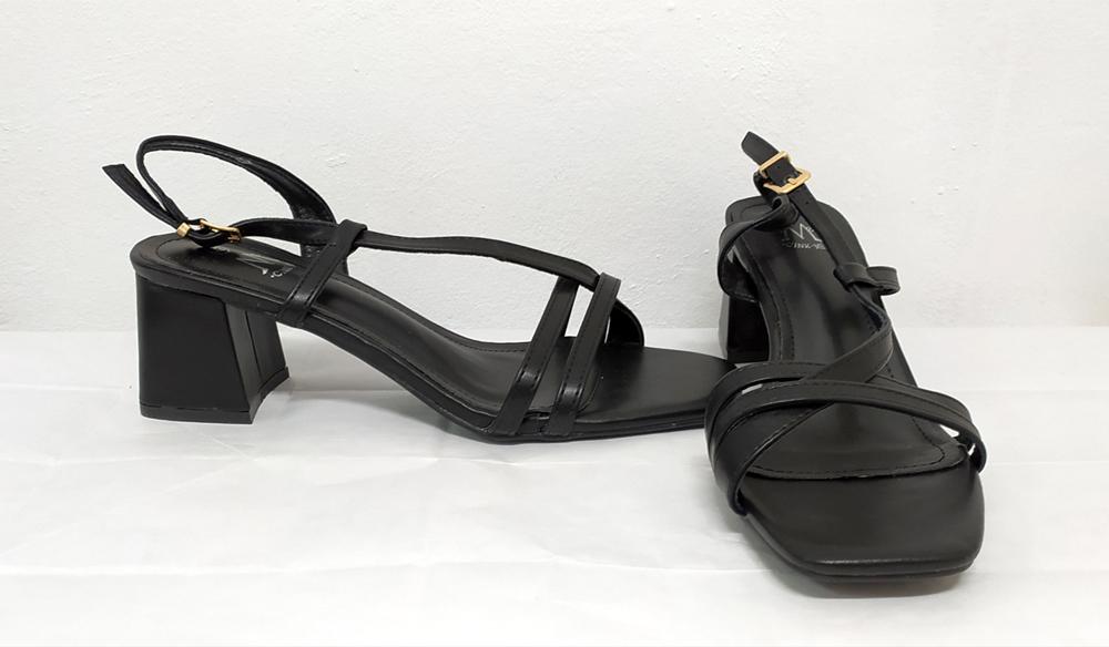 Sandalia en tacón asimétrico negro de 5 cm de alto. Doble cinta en la pala y una en diagonal sobre el empeine hasta la hebilla. Punta cuadrada. Dan Largo: