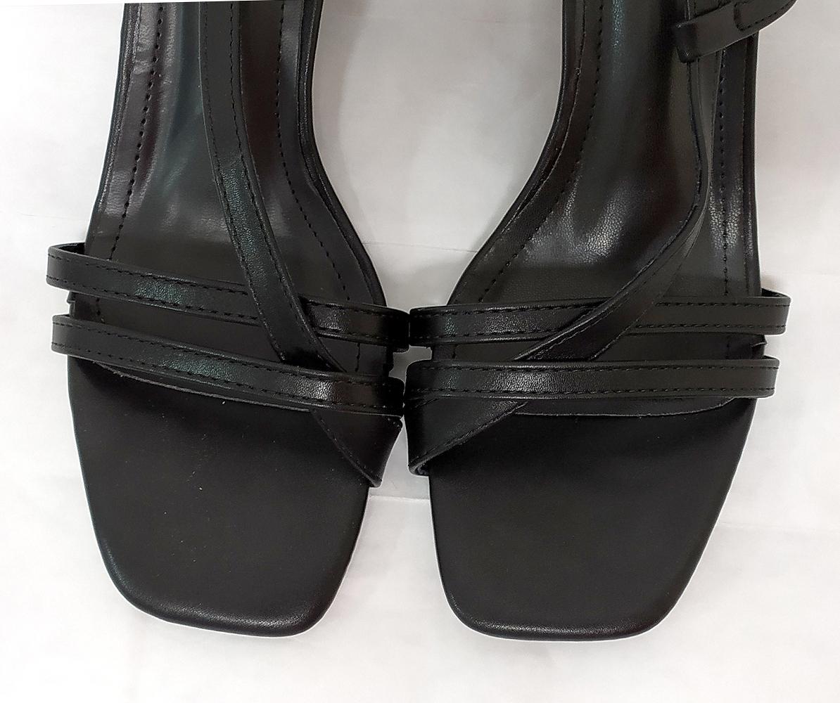 Tacón de 5 cm, asimétrico, para esta sandalia negra. Plantilla acolchada, suela en goma y punta cuadrada. Doble cinta en la pala y sujección en diagonal hasta la hebilla con goma. Dan largo, pide una talla menos que tus deportivas habituales: