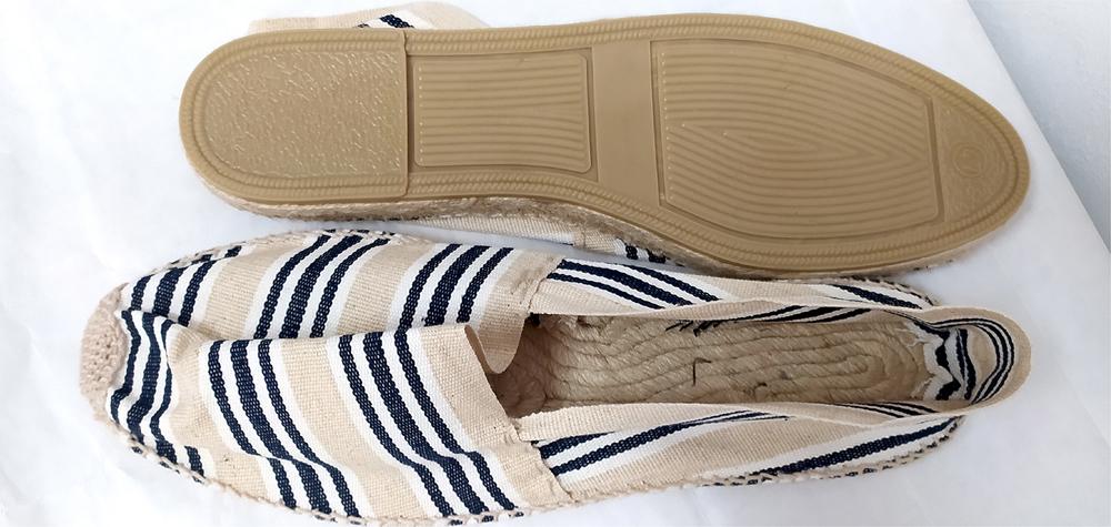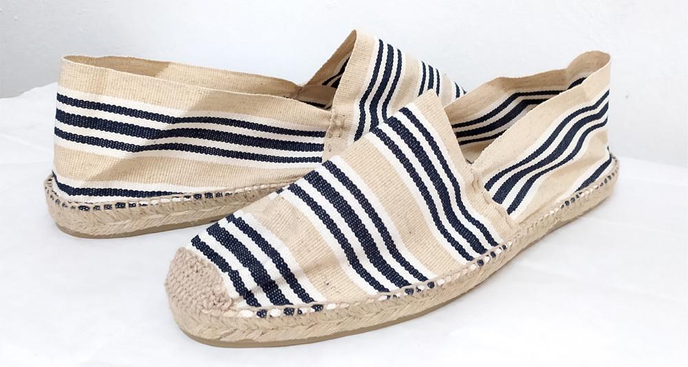 Alpargatas de o espadrilles de rayas en crudo y negro, un básico del verano. Cosidas a mano en España. Suela en goma. Pide una talla o dos menos que tus deportivas habituales. Y si eres de los que usan zapatos, tu talla de zapato de vestir: