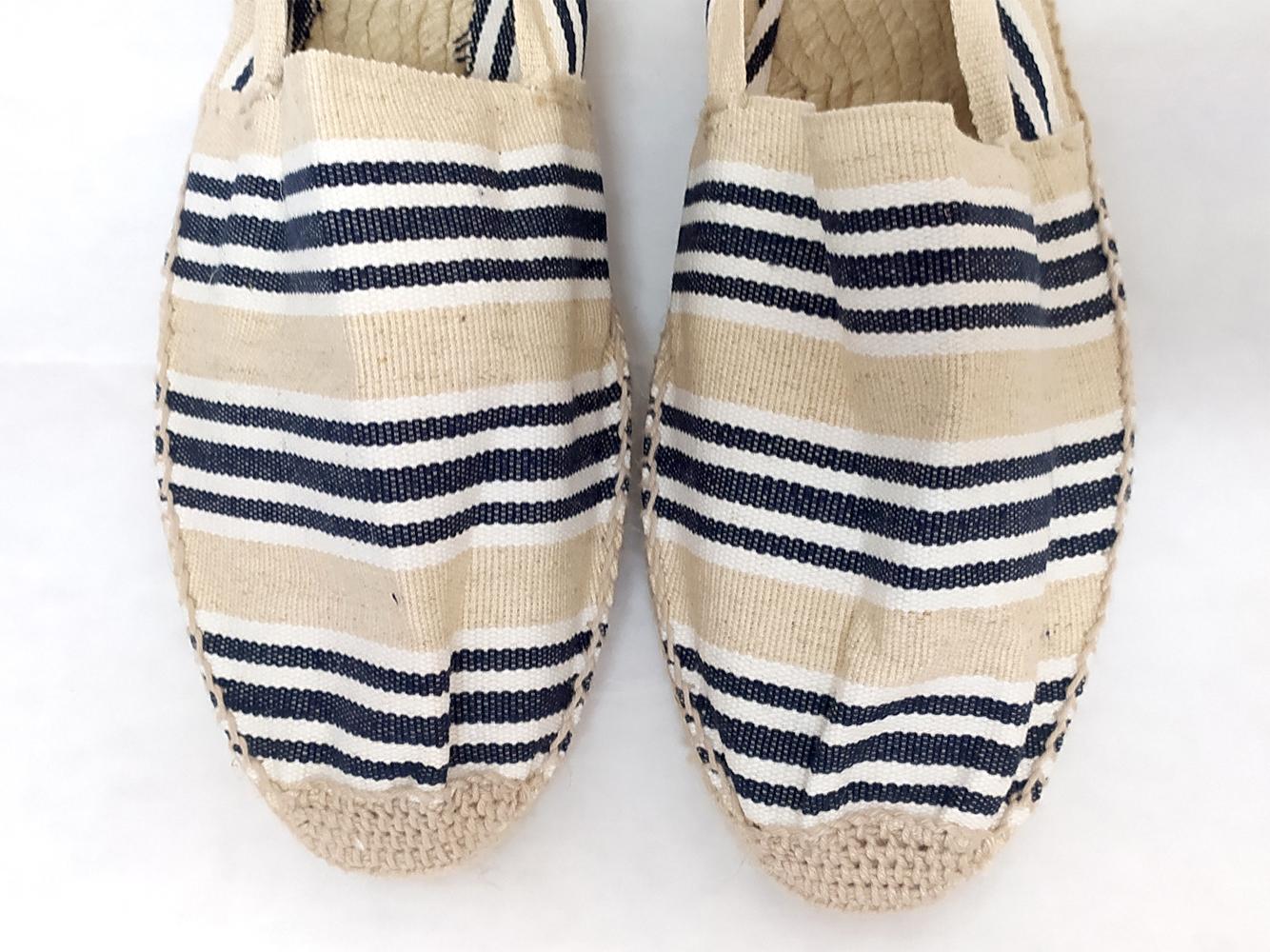 Crudo y negro para esta alpargata de rayas, una combinación clásica. Cosidas a mano y suela en goma. Solo en tallas grandes del 47 al 50. Dan mucha talla ojo a las medidas: