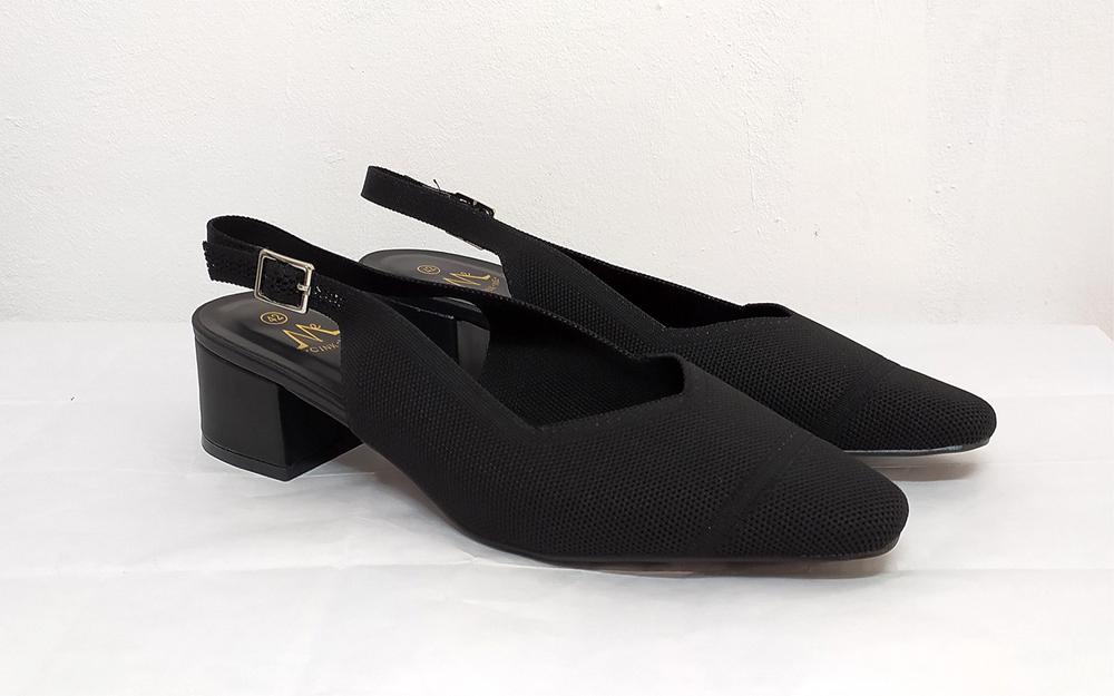 Zapato negro en tacón bajo, 3 cm, destalonado y en terminación en textil para estos días de verano o primeros de otoño. Ideal también para los eventos. Al ser textil no da problemas el ancho. Medidas de extremo a extremo, dejad espacio para la punta: