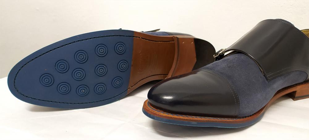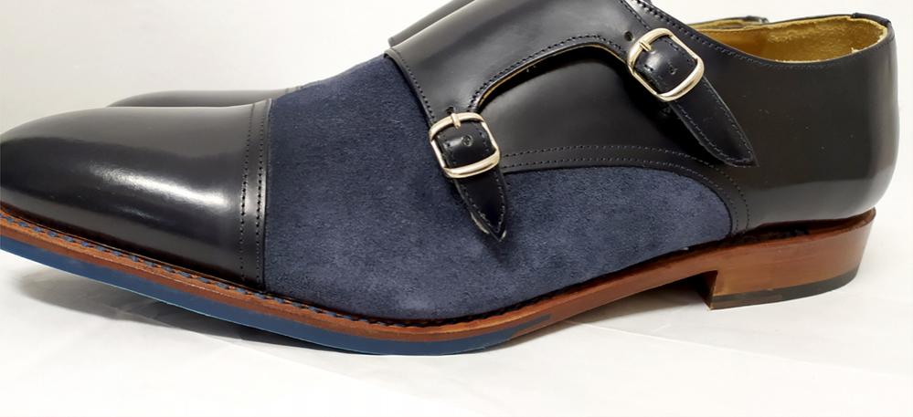 Munk o zapato de hebillas para hombre solo en tallas grandes. Doble terminación en ante y florantick azul marino para dar una mayor personalidad al zapato. La piel florantick con los cuidados irá cambiando de tonalidad dentro de los azules. Ancho 10, un poco más que los zapatos normales. Suela en cuero y goma azul al tono del zapato. Las medidas que os indicamos son de extremo a extremo: