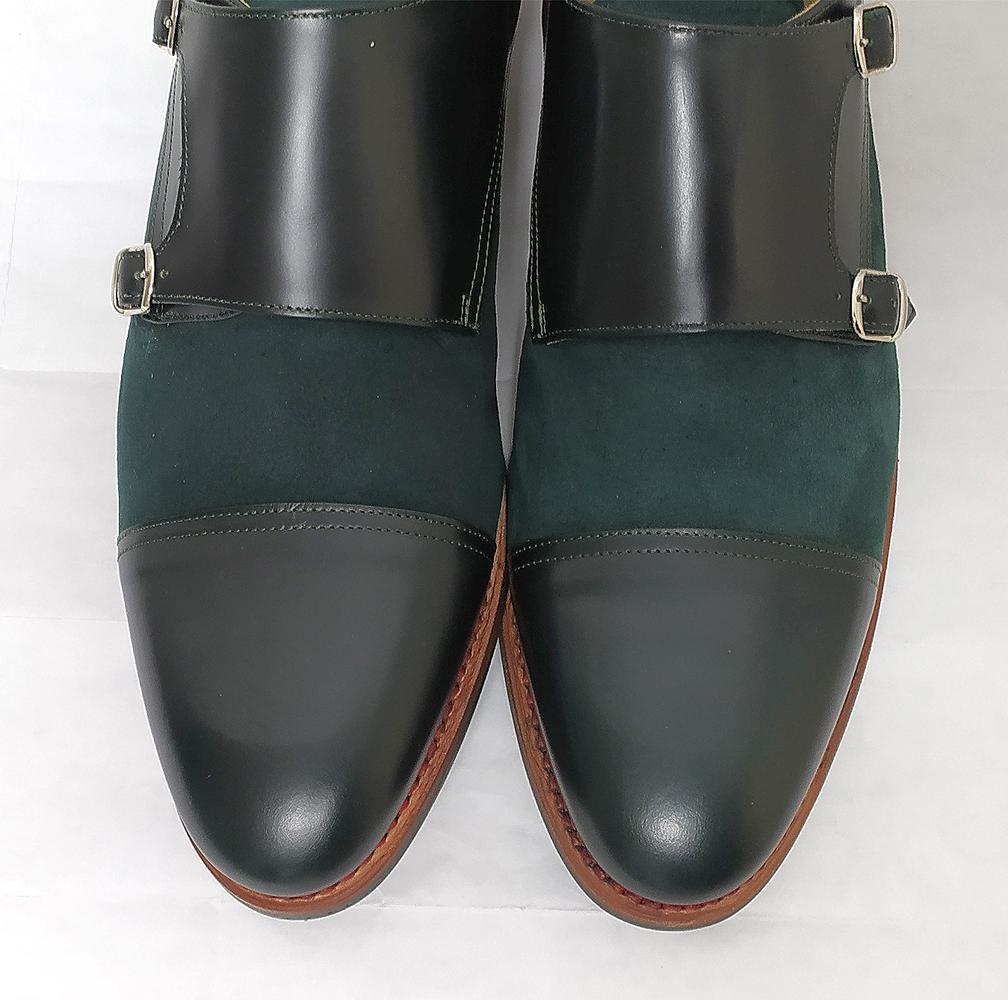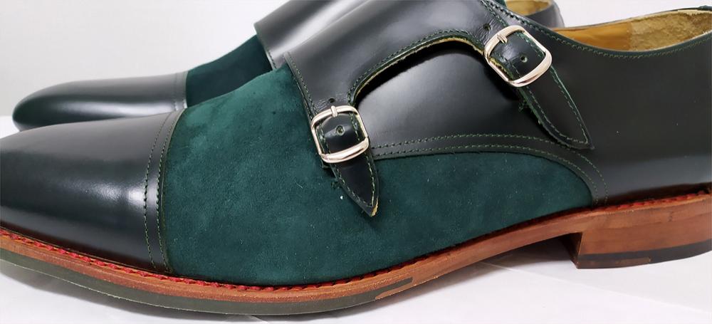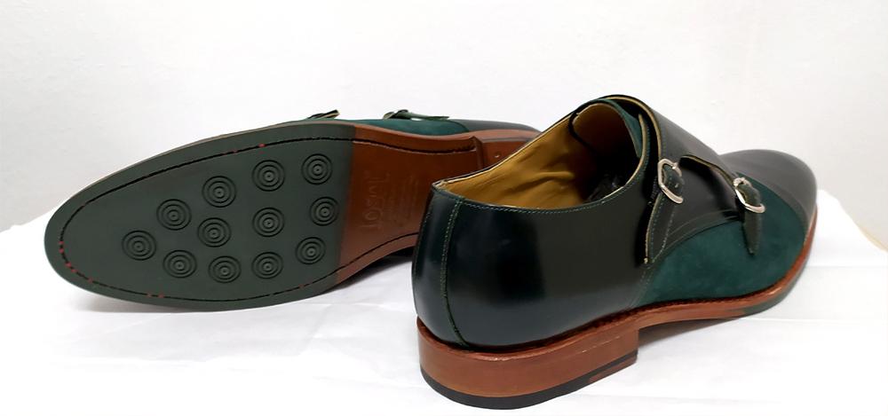 Zapatos de doble hebilla en verde y en tallas del 46 al 50. Terminación en ante verde botella y floranctick: Al cuidar este tipo de piel irá cambiando el tono del verde haciendo aguas y variando el zapato. La suela es de cuero también en verde. Un ancho 10, un poco más de lo normal para que puedas meter suna plantilla fina si no estás acostumbrado a la suela de cuero. Medidas de extremo a extremo, dan mucho más largo que una deportiva: