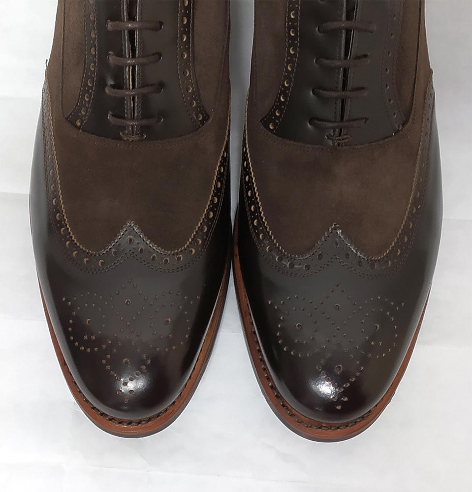 Zapatos de cordones para traje en marrón oscuro. Pala Vega son los picados que decoran la pala. Hemos combinado ante y piel florantick para dar mayor personalidad al zapato. Suela de cuero y goma al tono del zapato. Ancho especial en tallas del 46 al 50. Dan más largo que las deportivas, atentos a las medidas de extremo a extremo: