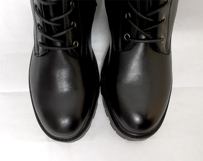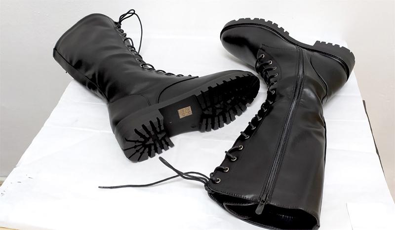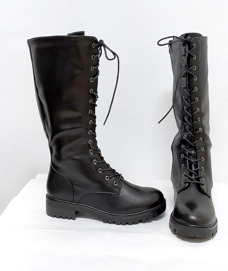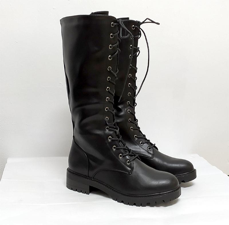 Bota estilo militar en caña alta. 38 cm de altura desde el suelo. Tallas del 41 al 44. Cordones en la parte delantera para dar ancho y cierre de cremallera en el interior. Suela militar de gran agarre y poco peso. Medidas;