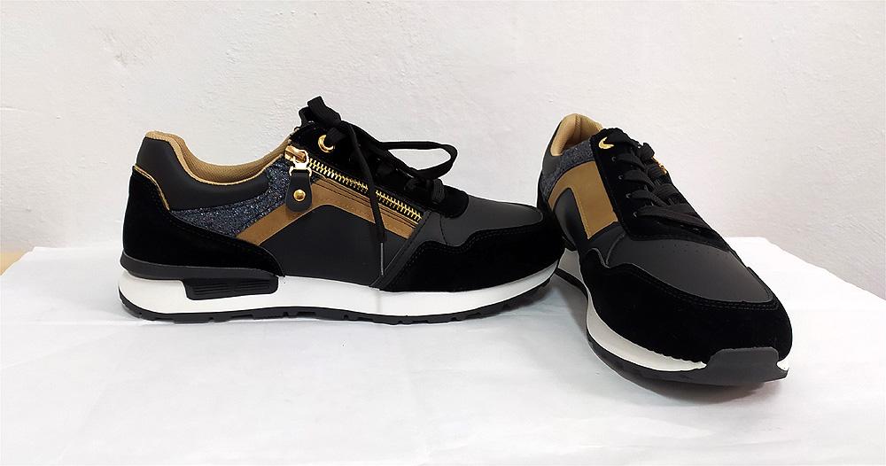 Deportivas moda en negro y dorado para los vestidos. Ya hemos trabajado este modelo (print animal), lo conocemos. En esta ocasión con una cremallera para ajustar cordones y luego ya no volver a atar. Especial pies anchos y problemas de dedos garra o martillo. Van justas de largo, atentas a las medidas: