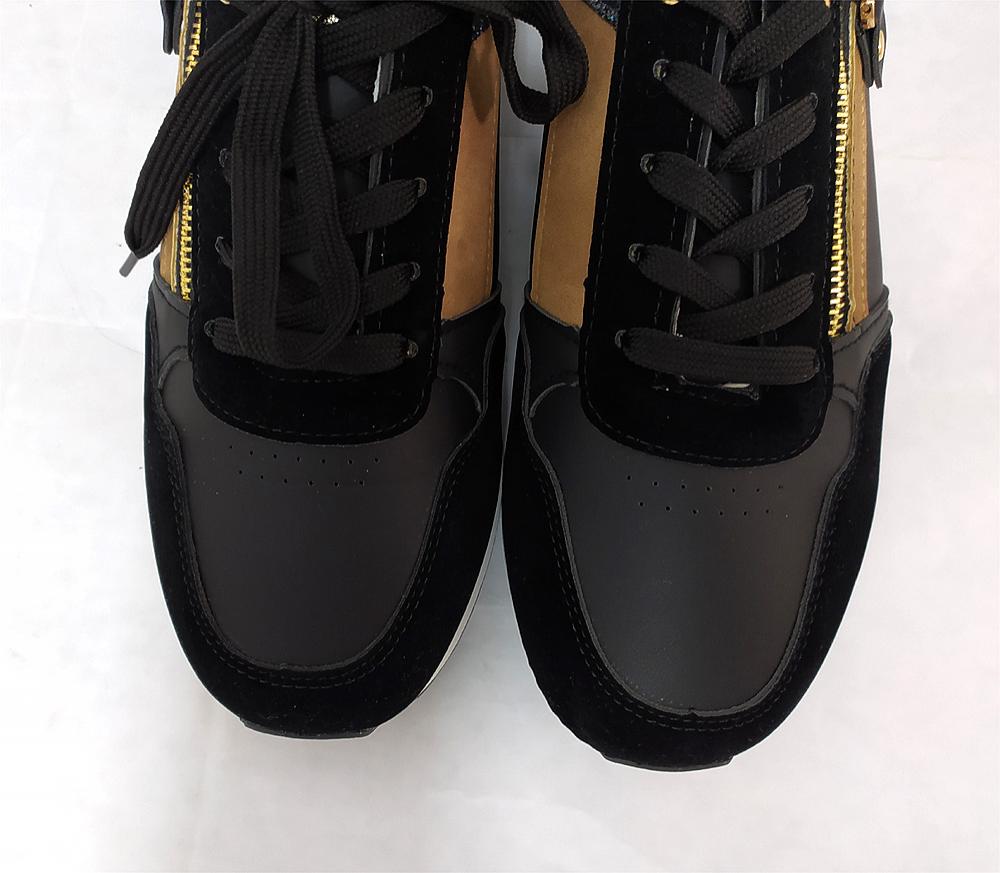Zapatilla deportiva de vestir en negro y dorado. Cierre de cordones y cremallera. Ajustas los cordones y luego ya solo abrir y cerrar. Dan ancho, alto de dedos pero justas de largo. Una horma que ya hemos trabajado. Suela con desnivel, antideslizante y que amortigua la pisada. Plantillas extraíbles. Os dejamos las medidas: