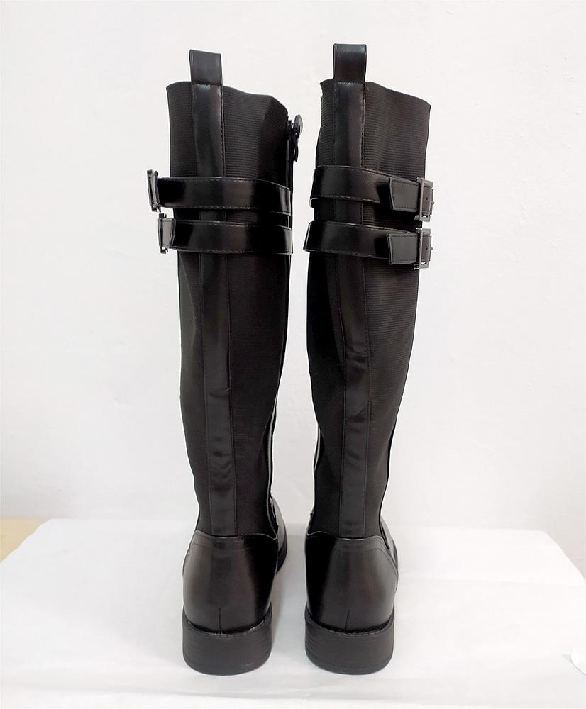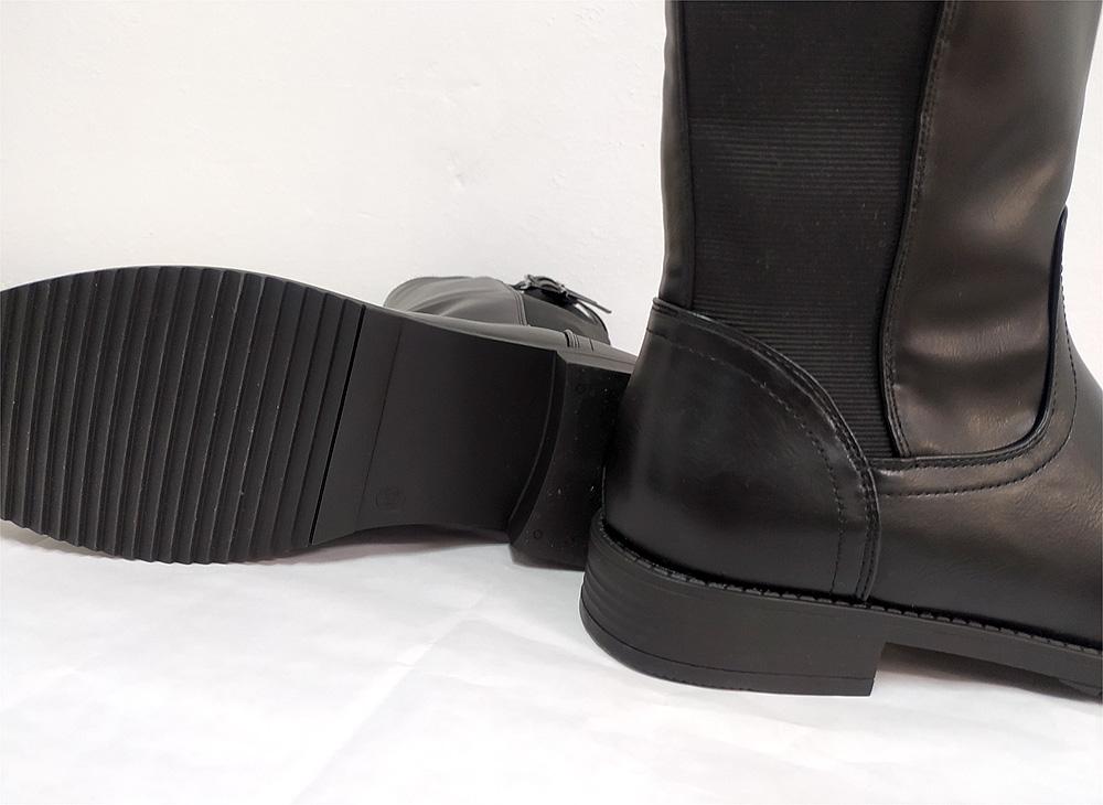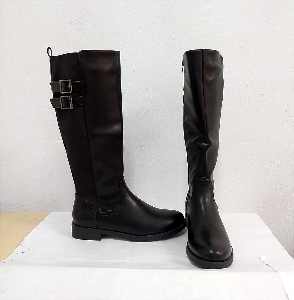 Bota alta en tallas grandes del 41 al 44 con elástico en la parte trasera hasta el tobillo. Doble hebilla decorativa en el gemelo. Suela de goma antideslizante. Terminación en piel sintética, aptas para la lluvia. Medidas de ancho de caña SIN FORZAR, añade 5 cm más con el ancho de la goma.