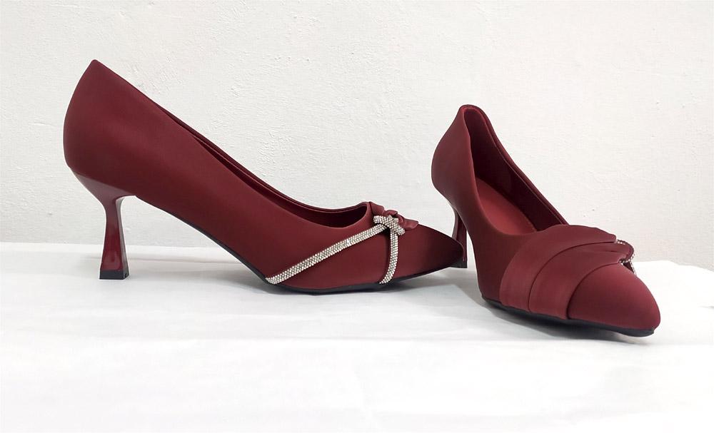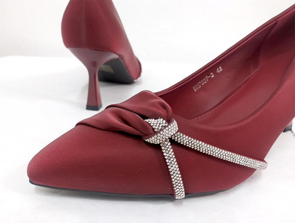 Elegante zapato de salón en burdeos con tacón de 7 cm de alto. Imitación a raso en el forro exterior y delicada pedrería en el lateral. Para pies normales respecto el ancho. Y sobre las medidas, el largo, lo indico dejando libre la punta. De extremo a extremo, para las que tienen el segundo dedo más largo añadid 1,5 cm más. Las medidas son , más bien, lo que debería medir vuestro pie: