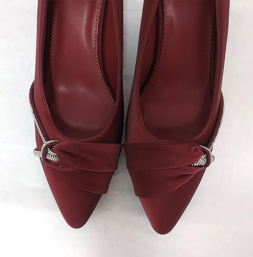 Espectacular zapato de salón en imitación raso burdeos con una tira de pedrería en la pala. Tacón carrete fino de 7 cm. Ajustan bien por detrás, plantilla acolchada en metatarso. Pies normales de ancho. Para las medidas os indico el largo hasta el fin de la tela que cruza sobre la pala dejando libre la punta (ver foto). Si añadís punta 1,5 cm más, por ejemplo un 44 de extremo a extremo mide 30,2 cm: