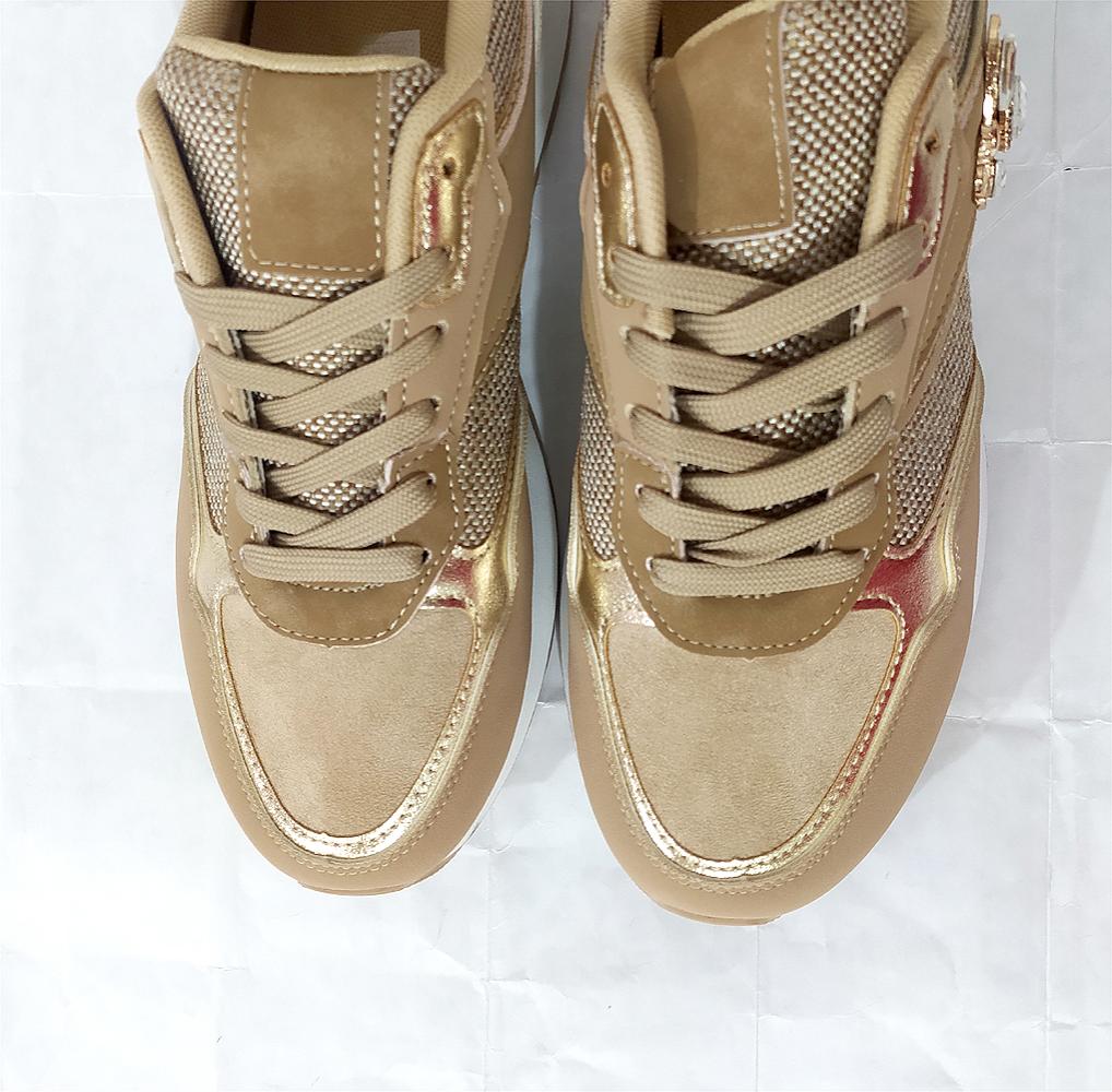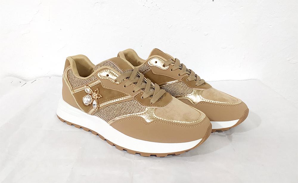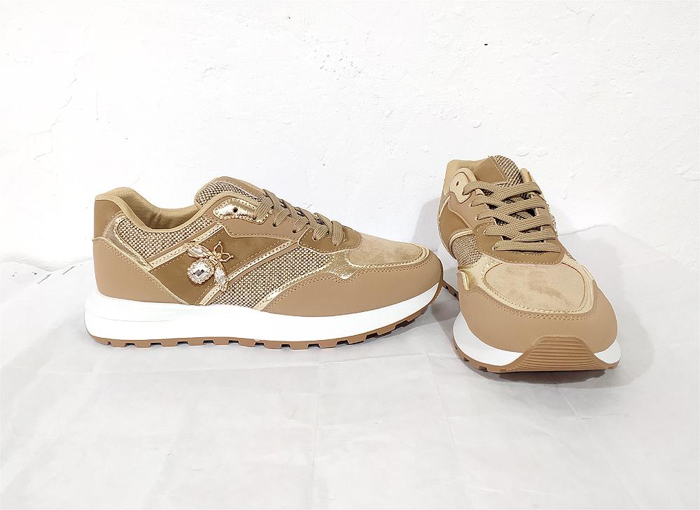 Deportiva en ancho especial en color kaki, beige y dorado. Uno de nuestros modelos más vendidos por ser un zapato de moda para pies con problemas de juantes o dedos garra. Mezcla de materiales y plantillas extraíbles. Atentas a las medidas si no conoces el modelo, van justas de largo:
