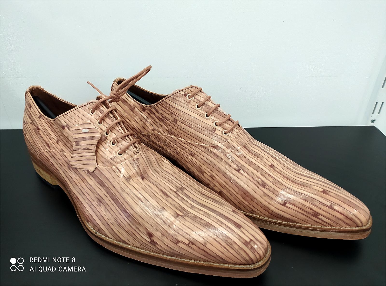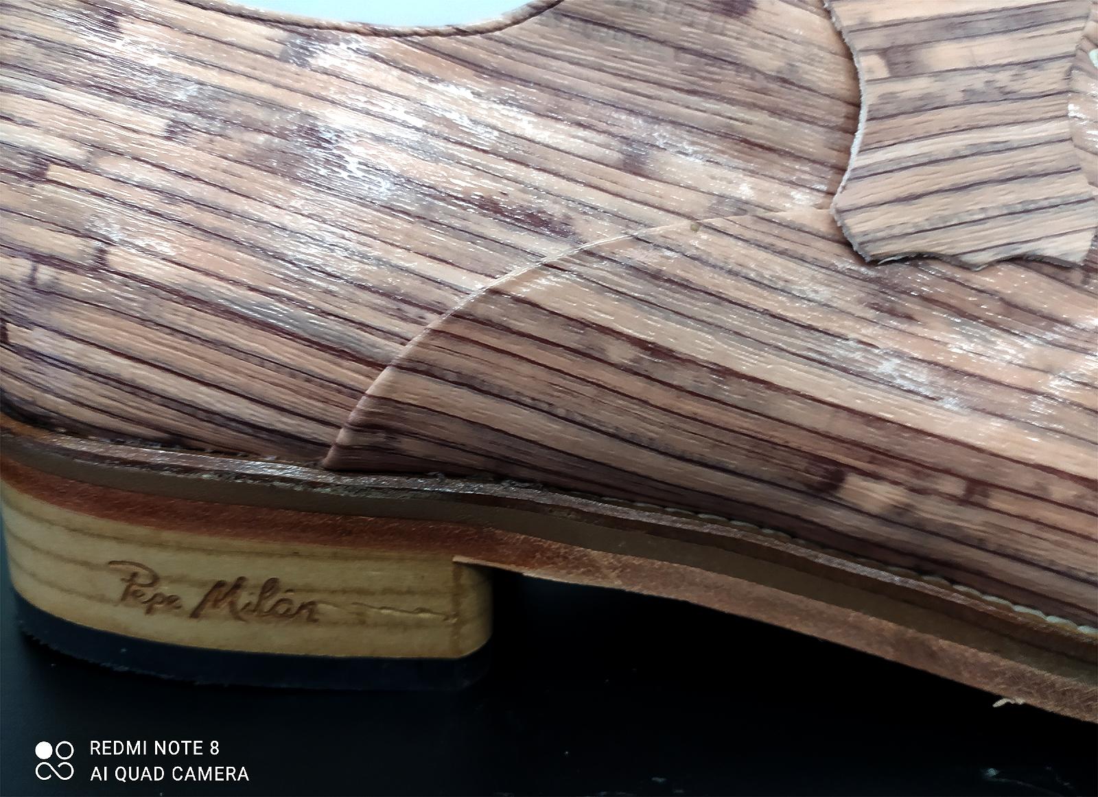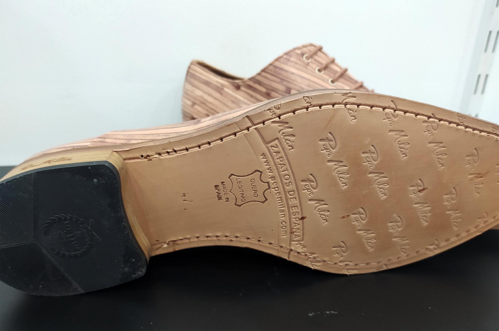 Los zapatos diferentes de Pepe Milán también en tallas grandes. Si eres de los que disfrutan con un zapato, éste es de los que causan sensación. Cuando está en el escaparate la pregunta es si es madera. No, piel imitación a bambú, solo tallas 47 a 49. Dan ancho y de largo el habitual de nuestros zapatos sin contar la punta. Cordones en dos colores.