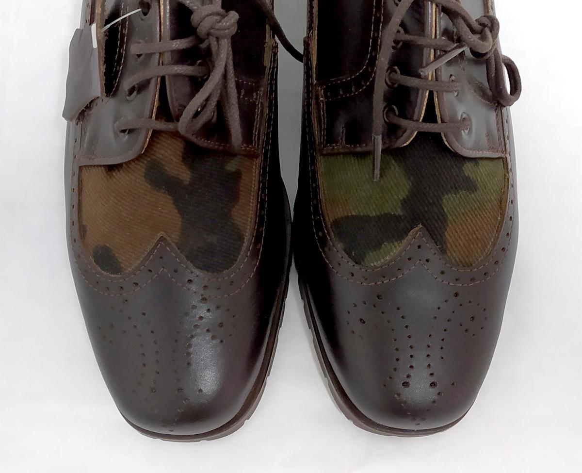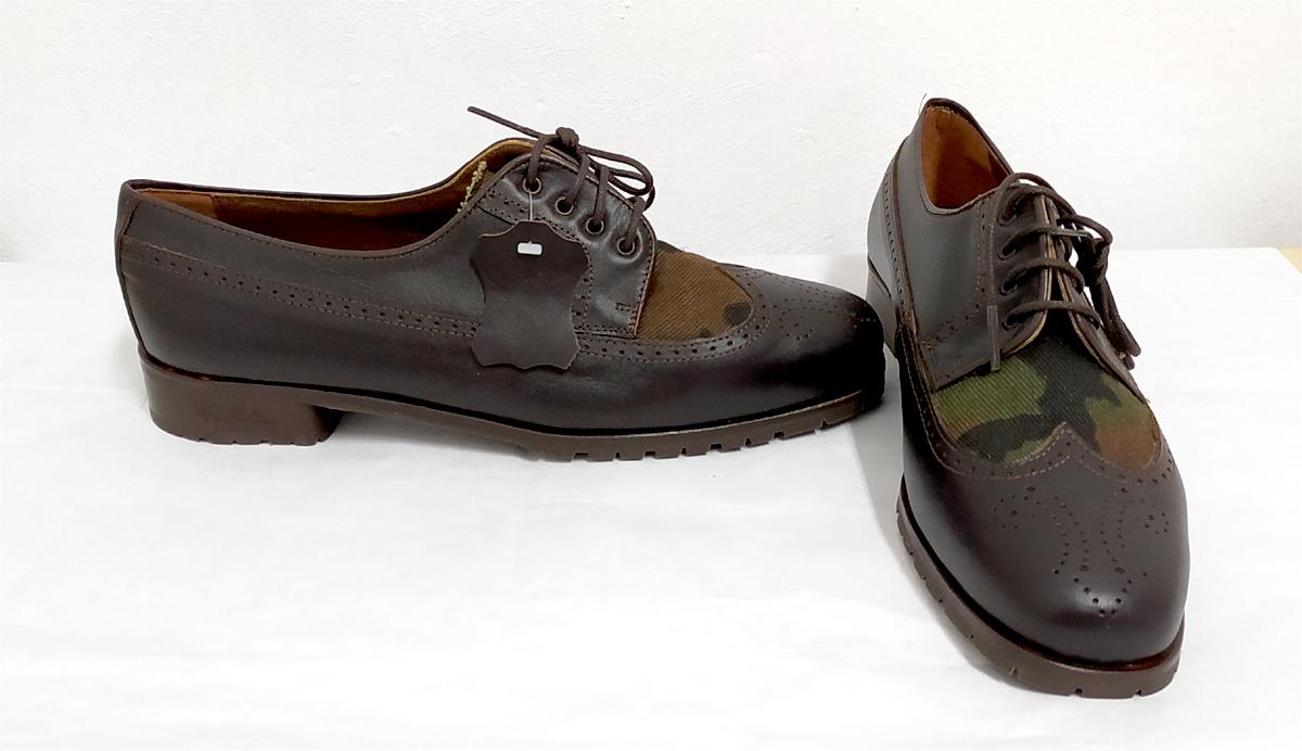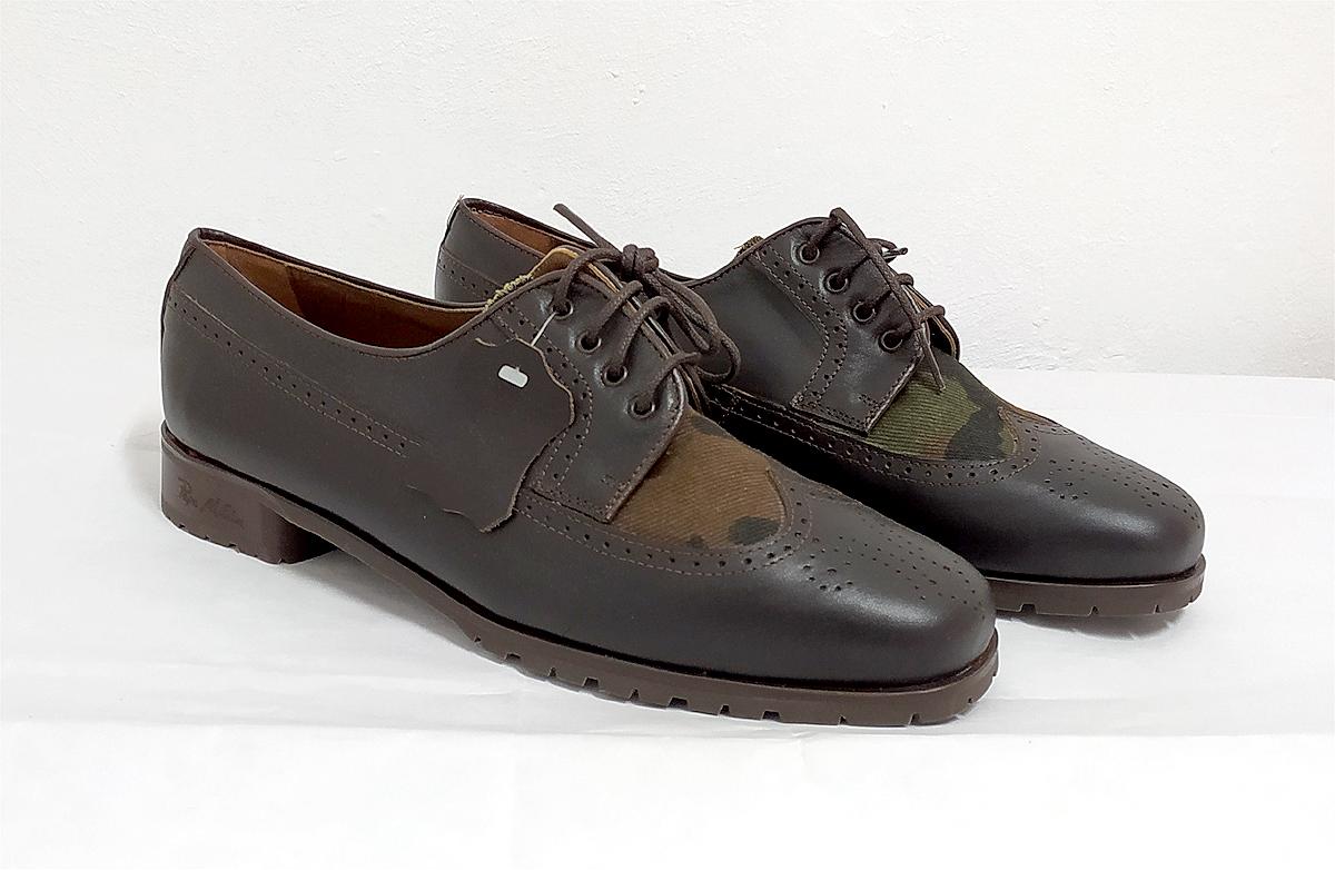Zapato unisex pero por tamaño en nuestra sección de mujer. Blucher picado en marrón y textil camuflaje. Para pies estrechos. Un zapato de Pepe Milán para nuestras chicas. Además de estrechos son cortos de largo. Os indicamos las medidas exactas, tendréis que añadir 5 mm a la medida de vuestro pie para que no rocen en la punta: