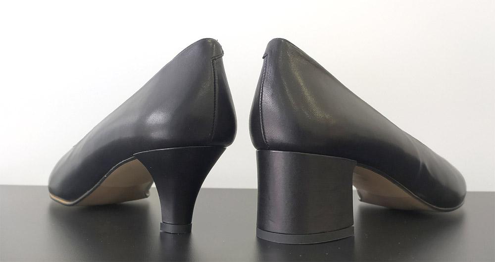 Misma altura que el salón negro de tacón grueso pero en disminución para dar un toque más vestir. Altura de 4 cm. Piel muy suave que se adapta al pie suela gruesa con plantilla interior para ir cómoda todo el día. Admite juanetes y otros problemas de pie. Dan talla de largo pero si necesitas ancho puedes pedir una talla más.