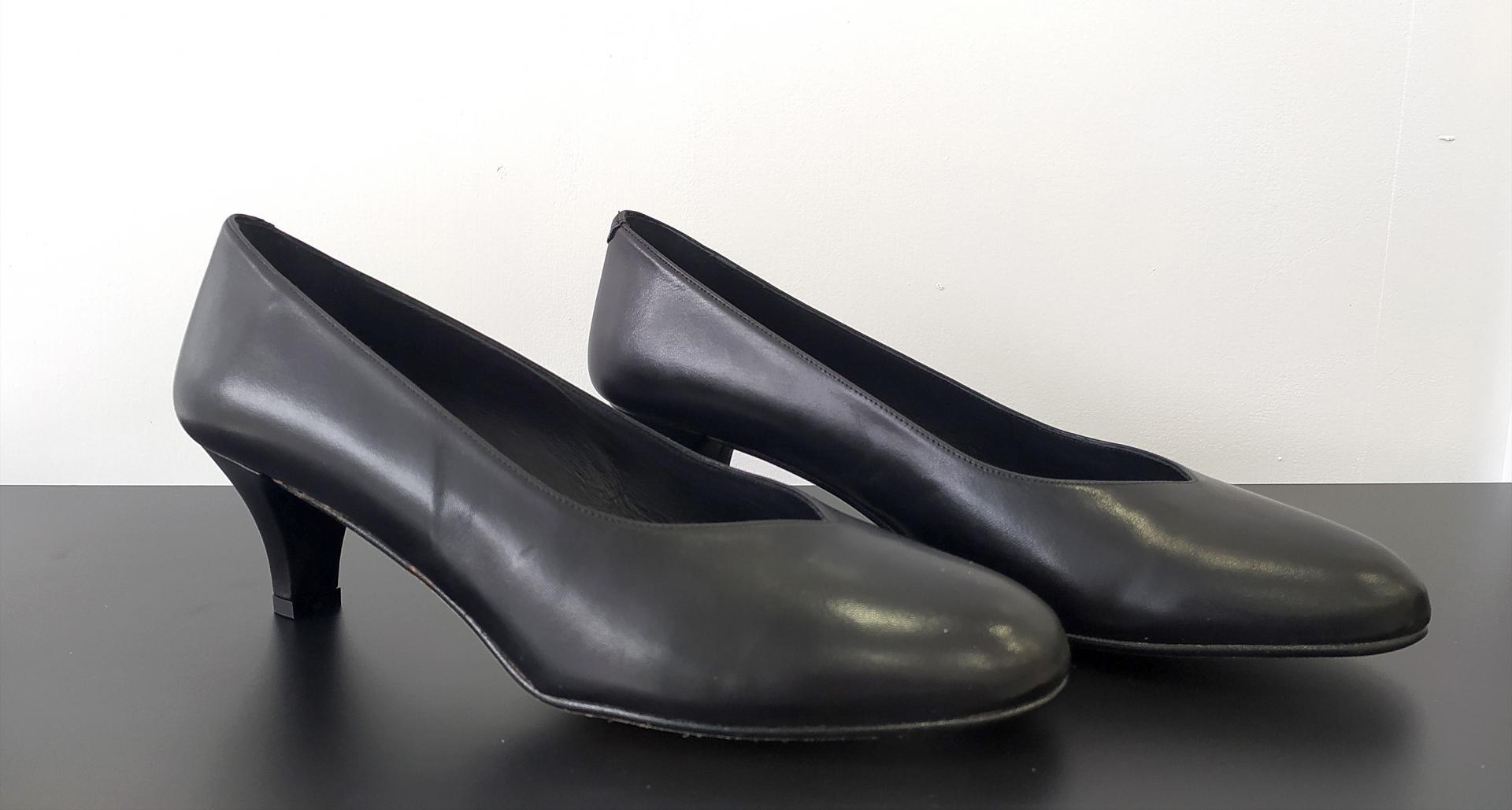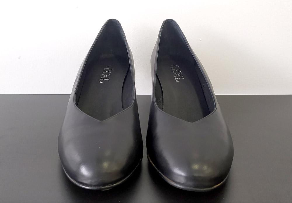 Salón negro básico de 4 cm de alto en tacón fino, también disponible en grueso. Solo tallas del 41 al 46. En piel muy suave, con plantilla interior y suelas gruesas en goma. Pala alta con terminación en pico para que se adapte a varios anchos de pie. Medidas exactas de largo, dan talla:
