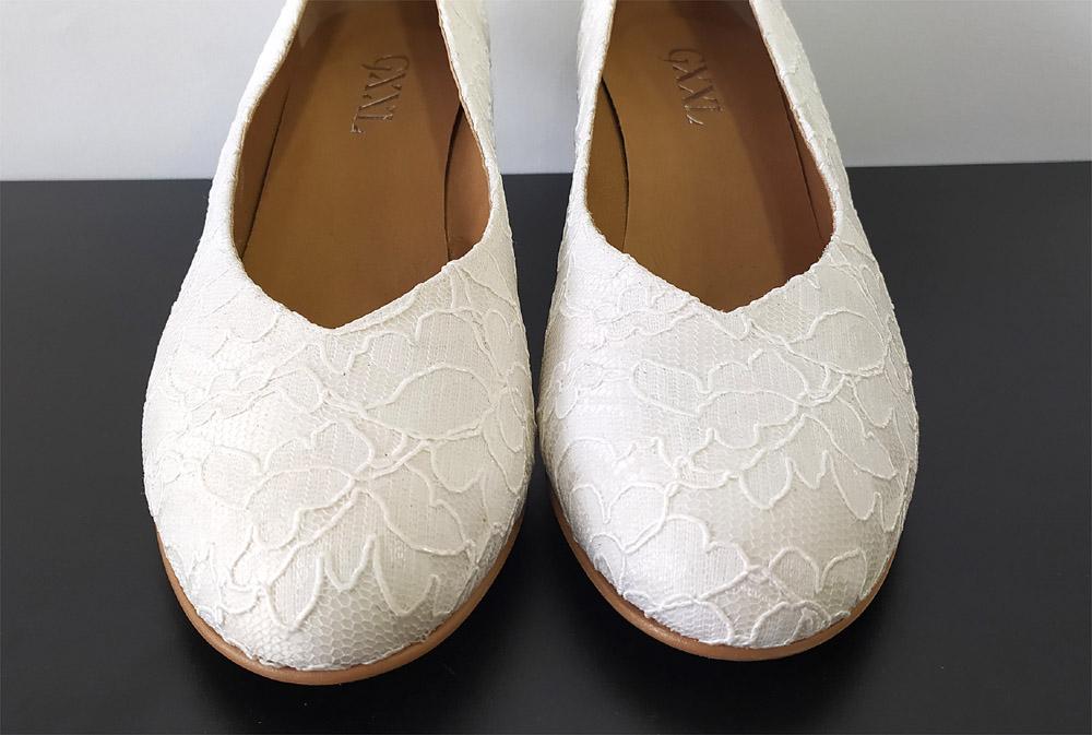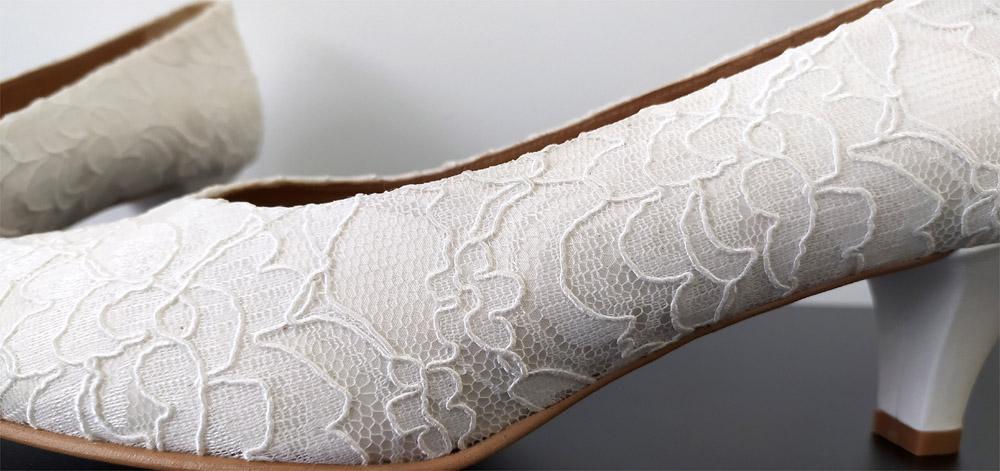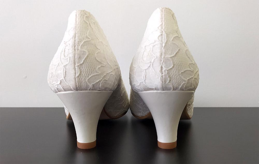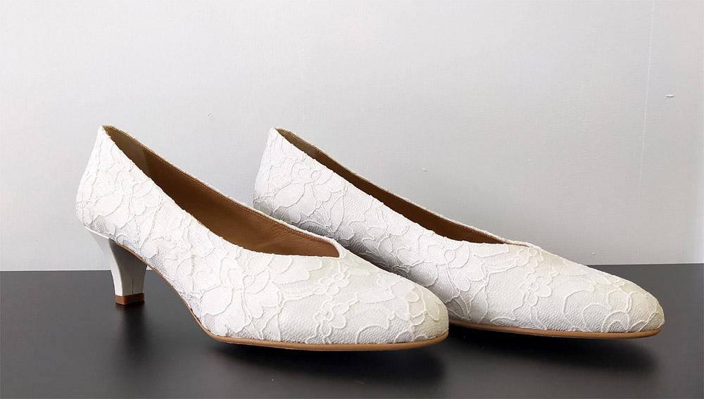 Zapatos para novia en tallas grandes del 42 al 45. Un salón básico en encaje y tacón fino de 4 cm de alto. Ancho normal pero adaptable a ancho en una talla más. Si no encuentras tus zapatos soñados en talla grande ponte en contacto con nosotros y los personalizamos. Medidas: